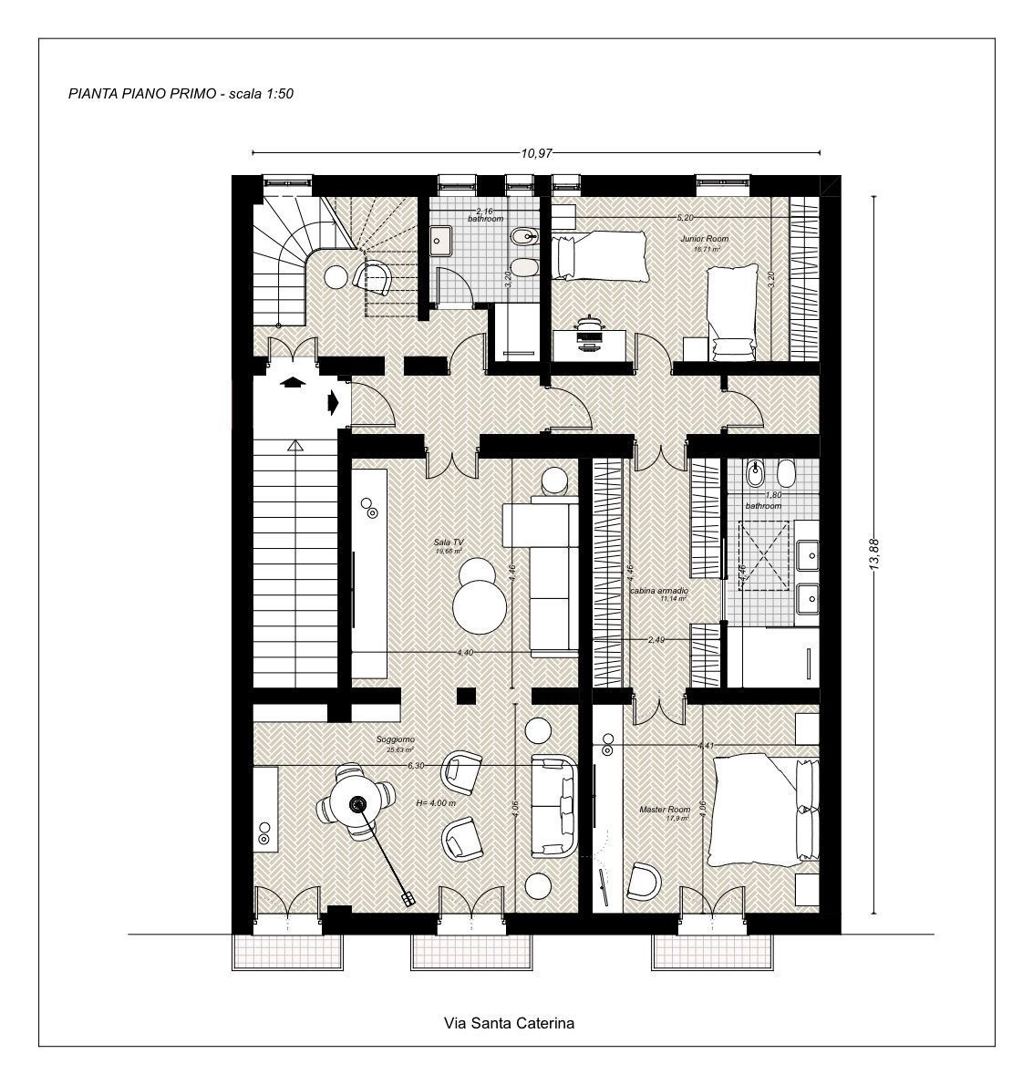 - Zona notte (circa 150 m²): fino a 3 camere da letto, 2 bagni, ripostiglio e possibilità di realizzare una suite padronale con cabina armadio.
